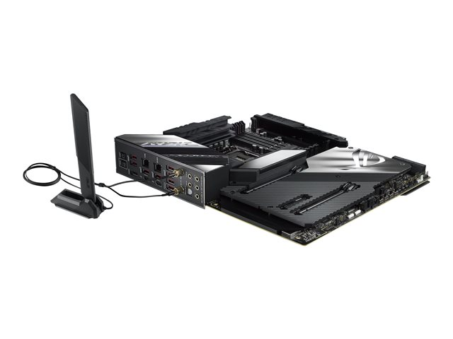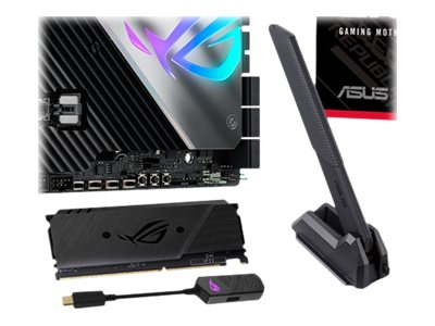 | Accessoires inclus | Autocollants pour ventilateurs ROG, câble d'extension de bande LED RGB (RGBW), 3 câbles de thermistance, support VGA ROG, carte de remerciement ROG, carte d'extension ROG DIMM.2 avec radiateur, tournevis, autocollant de plaque de logo ROG, Q-Connector, chaîne de clés ROG, antenne mobile ASUS Wi-Fi, lecteur USB, 1 à 3 câbles diviseurs de LED ARGB, 1 à 4 câbles répartiteurs de ventilateur, ROG Fan Controller, ROG CLAVIS DAC |