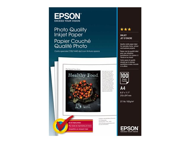 Epson Photo Quality Ink Jet Paper - Mat - enduit - blanc pur - A4 (210 x 297 mm) - 102 g/m² - 100 feuille(s) papier - pour EcoTank ET-2810, 2815, 2825, 2826, 2850, 2851, 2856, 4800, 4850; SureColor SC-P700, P900
